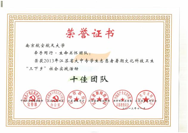 在2013年度江苏省大中专学生志愿者暑期文化科技卫生“三下乡”社会实践活动评比中,【牵手同行•生命关怀】团队荣获江苏省“十佳团队”荣誉称号。