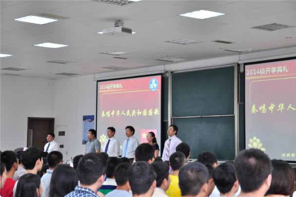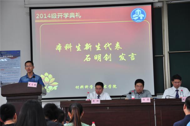 随后,在庄严的国歌声中,正式拉开帷幕。2014级本科新生石明钊首先代表新生作了发言。石明钊选择不让父母陪同独自一人入学报到,给身边的同学带来了满满的正能量。他的发言讲出了很多同学从高中走向大学的心路历程,也充满了对大学的憧憬。