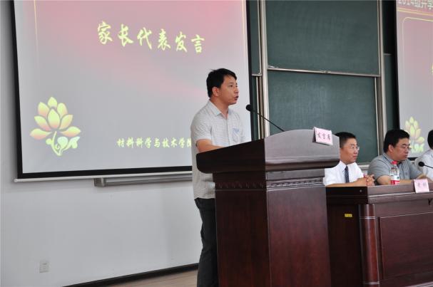 接下来,家长的发言将整个典礼推向了高潮。新生杨祎的父亲在讲到“儿行千里母担忧”时,数度哽咽。虽说父亲是山,母亲是水,但在孩子面前堂堂七尺男儿也表现出了母亲般的柔情。他表达了对学校学院的充分信任。在发言中,杨爸爸将四个“rong”字送给新生。第一个“融”是融入的融,他希望孩子们之间能互相关心、互相帮助,尽快融入到学校的集体生活中来;第二个“容”是包容的容,也是宽容的容。希望孩子们之间能够相互尊重、相互包容。第三个“熔”是熔炉的“熔”,希望学生们在六院这个集体大熔炉中,不断锤炼自己,互相鼓励、互相支持;第四个“荣”是荣誉的荣,希望孩子们能够珍惜、珍爱自己美好的大学时光,为父母、为班级、为六院创造更多的荣誉。