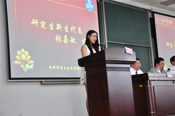 2014级研究生新生代表张嘉敏接着发言,作为一名本科就来自南航的“老”生。她的发言讲出了自己对南航的感谢,感谢南航为培养学生综合素质所搭建的各类平台。同时她讲出了研究生生涯的开启意味着自身需要更多一份责任,多一份独立,多一份思考。