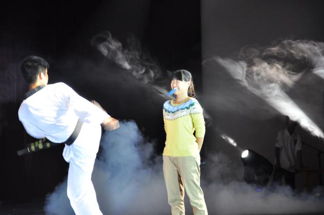 热情的开场舞点燃了全场气氛的同时,也带领观众们步入了晚会的第一篇章:律动迷彩。由张心怡和张琪玮两位同学带来的歌曲串烧,一动一静,引得观众掌声连连,将晚会推向首个高潮,接下来精彩的相声、舞蹈表演更是让台下的观众时而捧腹大笑,时而热烈欢呼。游戏环节更是让新生们见到了导员、教官、班主任大人们威严的外表下,可爱迷人的一面,为晚会增添了几分活泼气氛。一群俊男靓女带来的《南航军训的日子》将大家带入了对军训生活的回忆和对南航未来的期待,也将晚会送入第二篇章:乡之情,梦之逐。一段民乐串烧迅速使同学们低首沉默,陷入对家乡的深深思念。而小品《黑暗博士》让同学们在一阵又一阵的捧腹大笑中冲淡了对家乡思念的同时,也将晚会带入了高潮不断迭起的阶段。三位美女激情热辣的舞蹈和两位萌妹子调皮可爱的《love me》引得台下掌声阵阵,尖叫连连。教官们和同学们的合唱《真心英雄》引起了全场同学大声放歌,将晚会气氛推向致高点。最后,四位英姿帅气的学长携手奉上的歌曲《你是我的眼》以婉转动听的旋律为本次晚会画上了完美句点。