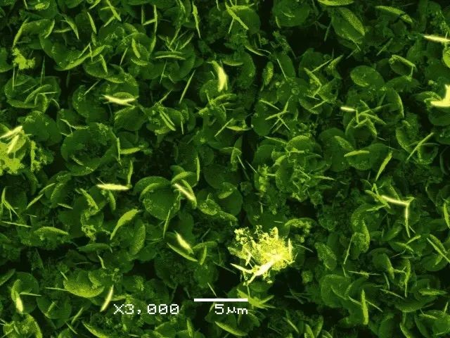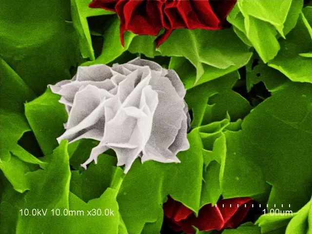 当看到图库里的电镜照片时,脑海中第一个想到的就是花丛,牡丹花这样富贵的大团花簇。于是给各个分明清楚的“花朵”加上了类似牡丹花的颜色。