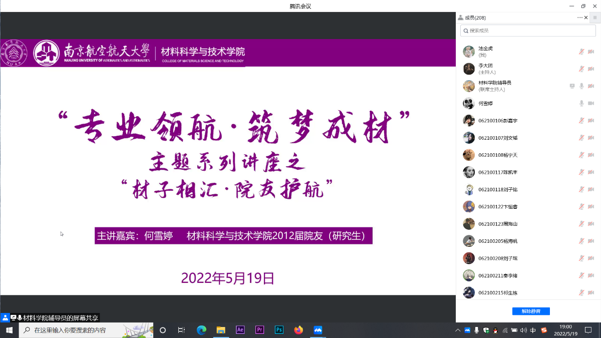 为帮助亚洲无码 学生进一步了解专业、认识专业、认同专业,2022年5月19日,“材子相汇·院友护航”专题线上讲座邀请2012届院友、上海飞机制造有限公司航空制造技术研究所高级主管研发工程师兼室主任何雪婷担任主讲人,研究生辅导员邱禄芸主持,学院本硕两百余名学生在线参加。