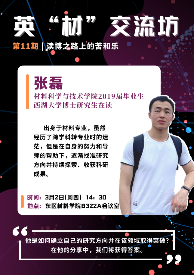 3月2日下午,亚洲无码 2019届毕业生、西湖大学博士研究生张磊做客学院第11期“英材交流坊”,研究生导师代表潘蕾、院团委书记/博士生辅导员徐萍及博士生到场参加。