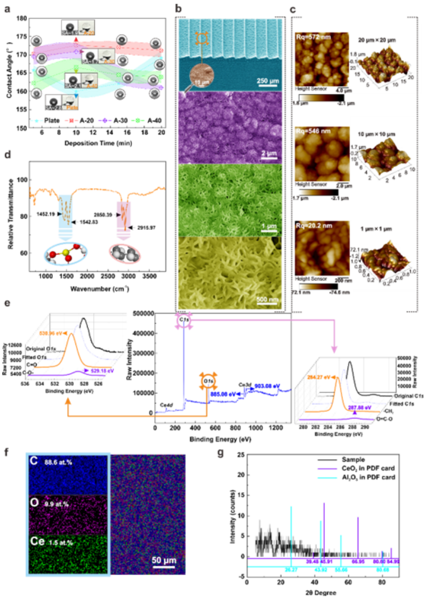 研究团队通过一步电沉积工艺将硬脂酸铈均匀覆盖于减阻微结构阵列,获得了不影响气动性能的超疏水表面。表面形貌分析结果显示沉积表面主要由一系列宽度约为50 nm的交错纳米棒组成的花瓣状结构组成,该结构具有高孔隙率,可以更大程度保留空气,从而使得该表面具有更高的疏水性能(接触角约170°,滚动角约为 1.7°)。值得注意的是,由于表面存在独特的减阻微结构阵列,液滴更倾向于沿微结构的迎风方向滚动,表明超疏水表面的非润湿性具有各向异性。基于FTIR、XPS、GIXRD等化学成分分析表征手段,可以判定复合结构表面提供超疏水性能的化学成分为[CH3(CH2)16COO]3Ce。