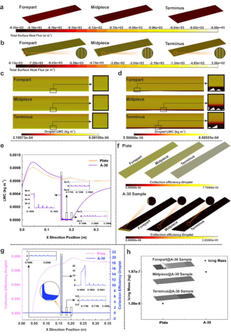 考虑到飞行器实际服役环境中面临的大量微小液滴,研究团队采用 Fluent- Icing方法预测了微小液滴的结冰行为。结果显示,与平板表面不同,A-30阵列结构表面的热通量沿来流方向逐渐降低,甚至在结构内部存在来自于微型涡旋与壁面摩擦产生的反向传热。此外液态水含量(LWC)分析表明,结构表面的低LWC条带随来流方向的延伸而逐渐上扬,且结构内部的 LWC 始终维持在极低的水平。因此,可以推断微结构阵列抬升了近壁面的低速流体,致使含有微小液滴的高速来流运动受到限制。由于微小液滴在低速流体中的运动存在滞后性,微结构的存在显著减少了液滴在结构上方的分布。值得注意的是,液滴收集系数曲线在首个结构单元上出现峰值,结合结冰分布结果,可以认为微观结构表面的冰层主要集中在微结构阵列的前端,且随来流方向逐渐减少直至消失。