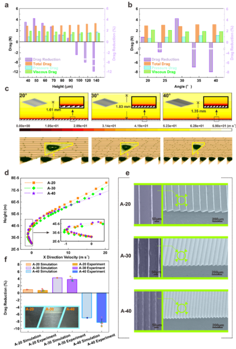 研究团队针对高速来流条件进行微结构减阻性能模拟计算,证实压差阻力随结构高度的增加而不断提升,而过高的总阻力主要是由于粘性阻力的降低逐渐难以补偿压差阻力的增长引起的。此外,结构角度的提升同样导致了压差阻力的增加,而粘性阻力则在30°角度出现了峰值。对该角度的微结构进行分析可知,微结构的出现在结构内部保留了大量低速流体,有效降低了近壁面的速度梯度。结构内部的微型涡旋以“滚动轴承”的形式减少了流体与壁面的接触,同时,微型涡旋带来的反向速度梯度为表面提供了一个反向推力,从而降低了表面粘性阻力。随后,基于航空用2024铝合金制备了相应微结构表面并进行了减阻性能测试,验证了结构设计及制备的可靠性。