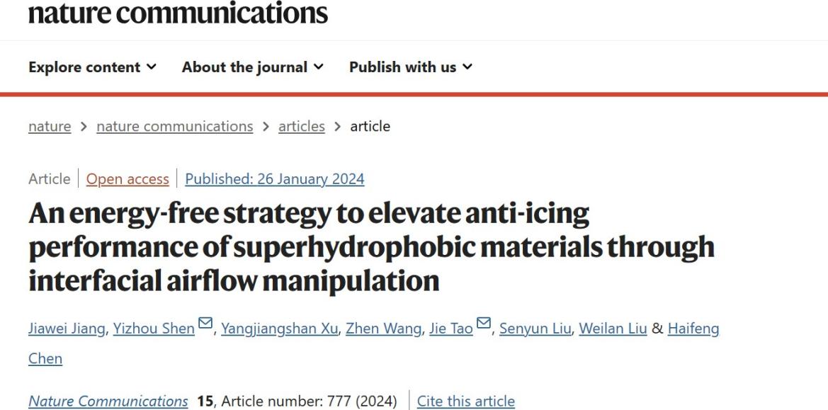 近日,亚洲无码 柔性成形技术及装备团队表面柔性加工方向陶杰教授和沈一洲教授在Nature Communications期刊发表了一篇题为“An energy-free strategy to elevate anti-icing performance of superhydrophobic materials through interfacial airflow manipulation”的研究论文,论文第一作者为江家威博士后,陶杰教授和沈一洲教授为通讯作者。