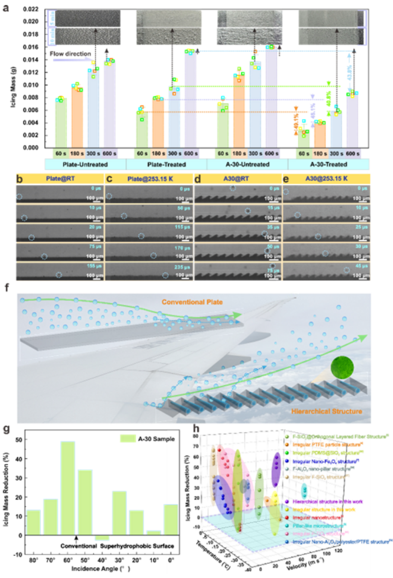 基于上述计算结果,将超疏水 A-30表面置于结冰风洞进行测试,结果显示表面积冰随来流方向逐渐降低,且10 min内的结冰质量较超疏水平板表面降低了40%以上。与超疏水平板表面相比,该试样表面在-20℃下仍可以观测到微小液滴的撞击弹离行为。考虑到微小液滴的运动行为主要由气流控制,受惯性和重力的影响较小,可以认为平板表面近壁面的低速流场难以提供液滴弹离表面的驱动力,而结构内部存在的微型涡旋则有助于液滴的脱离。因此,该研究团队认为,结构表面因结构气动特征引发的上升气流和超疏水微纳结构提供的液滴自驱离效应共同降低了超疏水表面的结冰概率。此外,具有特定角度的低能微结构表面可以有效延缓结冰形核过程,为微小液滴的弹离提供了更多的时间。