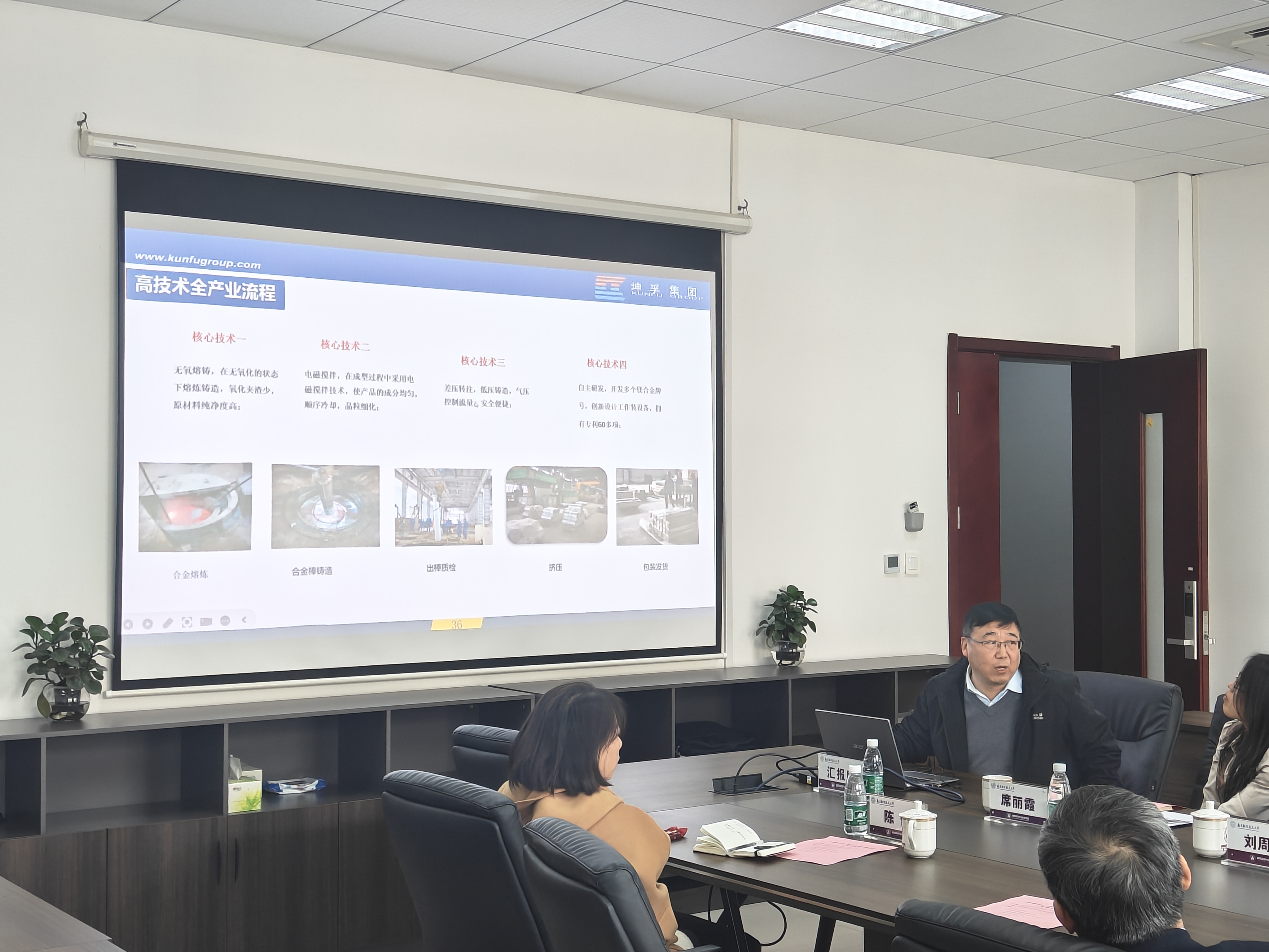 会上刘周成介绍了学院基本情况、主要科研方向和科研平台条件。王铭君介绍了上海坤孚业务板块、行业应用和研发设想,激光增材、柔性成性、复材制造、轻合金铸造等课题组老师分别介绍了相关技术成果。
