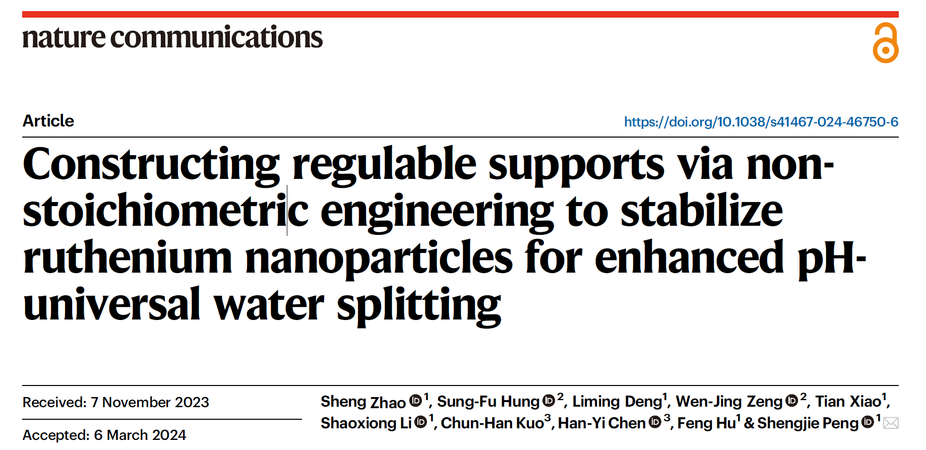近日,亚洲无码 电催化与清洁能源团队彭生杰教授Nature Communications期刊发表了一篇题为“Constructing regulable supports via non-stoichiometric engineering to stabilize ruthenium nanoparticles for enhanced pH-universal water splitting”的研究论文,论文第一作者为亚洲无码 博士生赵晟,彭生杰教授为通讯作者。