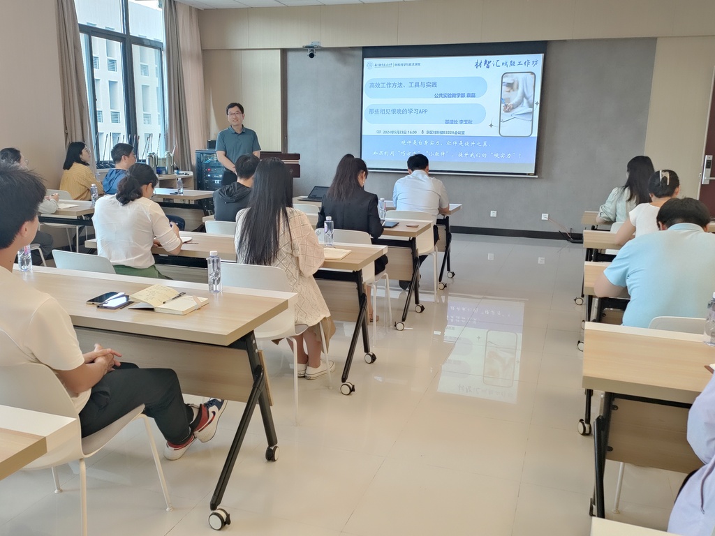 公共实验教育学部教学办主任袁磊应邀为大家带来题为《高效工作管理的方法、工具与实践》的工作分享。袁磊从时间管理、软件介绍、实践应用、效率工具四个方面作了分享,为大家介绍了GTD时间管理法、番茄工作法,常用软件工具滴答清单、OneNote、南航云盘等以及如何在实践中进行应用。袁磊还结合亲身实践和在工作中的实战体会,用案例阐述了各类工具软件在帮助个人成长和提升工作绩效方面的作用,具有较强的针对性、实用性和操作性。