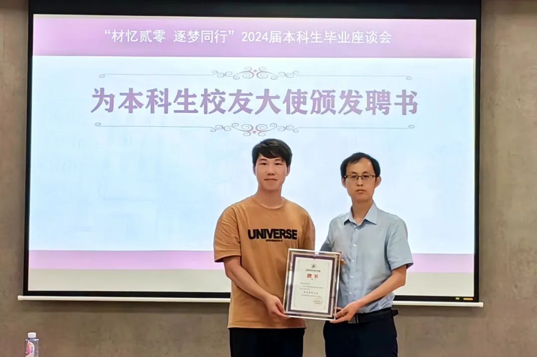 为了进一步加强校友与母校之间的联系,促进校友间的交流与合作,学校在每个学院中特别选拔了一名优秀的毕业生担任校友联络大使。常树全为2024届本科生校友大使张中阳同学颁发聘书。