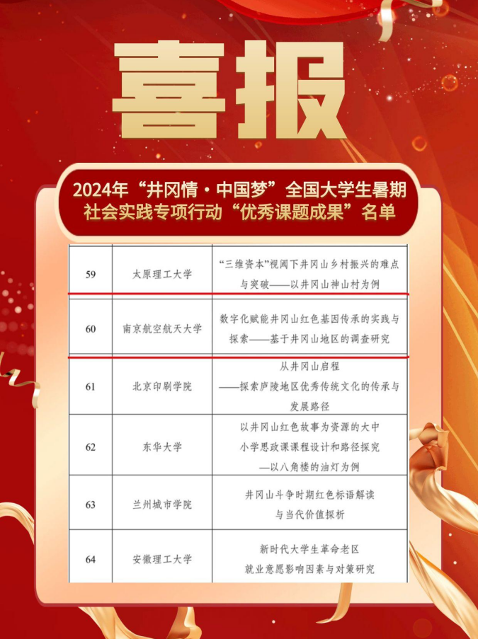 近日,2024年“井冈情·中国梦”全国大学生暑期社会实践专项行动优秀课题成果遴选结果揭晓亚洲无码 “恰少年风华正茂”井冈山精神宣讲团撰写的实践课题“数字化赋能井冈山红色基因传承的实践与探索”成功入选“优秀课题成果”!